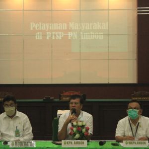Sosialisasi Pelayanan Masyarakat di PTSP Pengadilan Negeri Ambon dibuka oleh Bpk P.Tarigan,SH.MH Ketua Pengadilan Negeri Ambon dan dipaparkan oleh Bpk Alex.T.Tobing,SH.MH Hakim Ad Hoc Perikanan Pada Pengadilan Negeri Ambon Rabu,22 Juli 2020