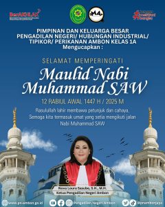 Pimpinan dan Keluarga Besar Pengadilan Negeri / Hubungan Industrial / Tipikor / Perikanan Ambon Kelas 1Am A, mengucapkan : Selamat Memperingati Maulid Nabi Muhammad SAW12 Rabiul Awal 1447 H / 2025 M Rasulullah lahir membawa petunjuk dan cahaya. Semoga kita termasuk umat yang setia mengikuti jalan Nabi Muhammad SAW ——- Jika Anda memiliki pertanyaan seputar […]