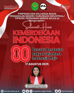 Pimpinan dan Keluarga Besar Pengadilan Negeri / Hubungan Industrial / Tipikor / Perikanan Ambon Kelas 1A, mengucapkan : Selamat Hari Kemerdekaan Republik Indonesia Ke-80 Tahun 202517 Agustus 2025 Mari Bersama Lanjutkan Perjuangan dengan Karya dan Kontribusi Nyata Demi Indonesia yang Maju dan Sejahtera “Bersatu Berdaulat, Rakyat Sejahtera, Indonesia Maju” ——- Jika Anda memiliki pertanyaan seputar […]
