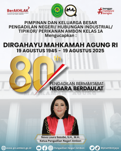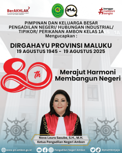 Pimpinan dan Keluarga Besar Pengadilan Negeri / Hubungan Industrial / Tipikor / Perikanan Ambon Kelas 1A, Mengucapkan : Dirgahayu Provinsi Maluku Ke-80 Tahun 2025“Merajut Harmoni Membangun Negeri” ——- Jika Anda memiliki pertanyaan seputar pelayanan pada Pengadilan Negeri Ambon Kelas 1A, silahkan menghubungi kami melalui Direct Message Instagram atau bisa mengirimkan email ke pnambonpengadilan@yahoo.co.id Kami menyambut […]